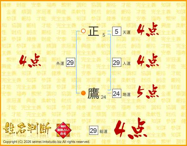 あなたの人生を表す1番重要な運勢です。生涯を通じて影響する総合運となり、主に50歳以降の晩年期に影響を及ぼします。苗字と名前の合計画数。