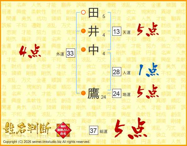 生活面を象徴する運勢です。外部から受ける影響力を表し、結婚運、家庭運や職場、環境への順応性を表します。総運から人運を引いた画数。姓や名が1文字の場合を除く。