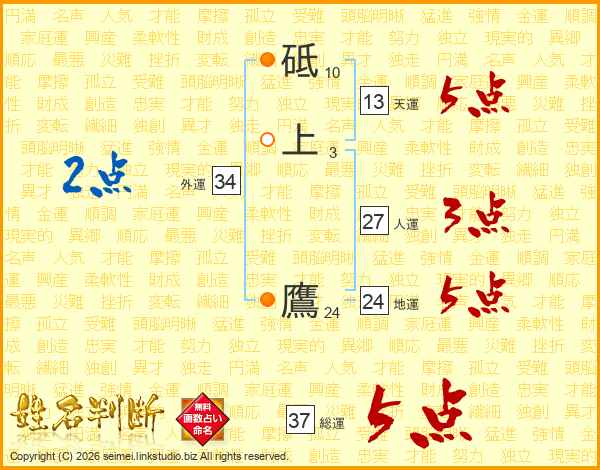 生活面を象徴する運勢です。外部から受ける影響力を表し、結婚運、家庭運や職場、環境への順応性を表します。総運から人運を引いた画数。姓や名が1文字の場合を除く。