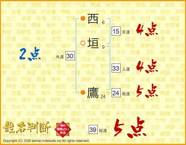 西垣鷹さんの総運は39画の5点!