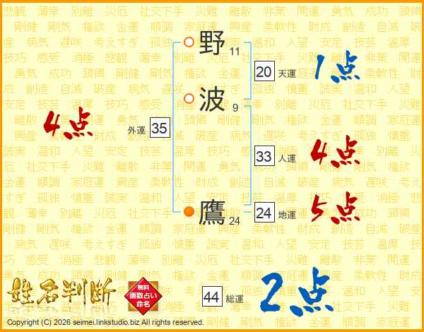野波鷹さんの総運は44画の2点!
