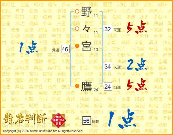 野(11画)々(11画)宮(10画) 鷹(24画)