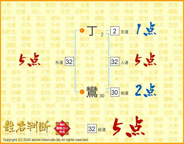 生活面を象徴する運勢です。外部から受ける影響力を表し、結婚運、家庭運や職場、環境への順応性を表します。総運から人運を引いた画数。姓や名が1文字の場合を除く。