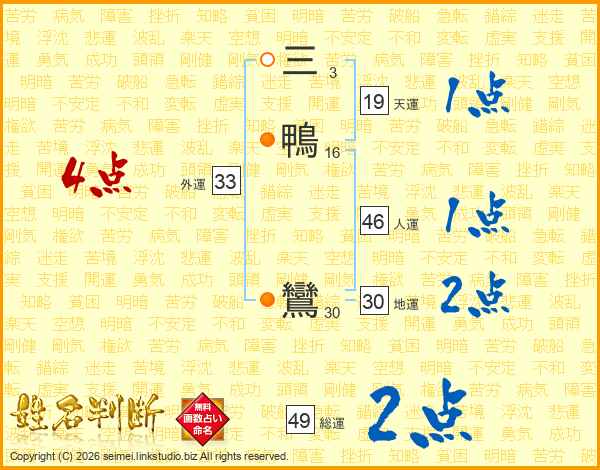 画数の奇数(○陽)と偶数(●陰)の配列で吉凶を占います。どちらかにかたよる名前は大凶名で避ける必要があります。画数の奇数偶数。