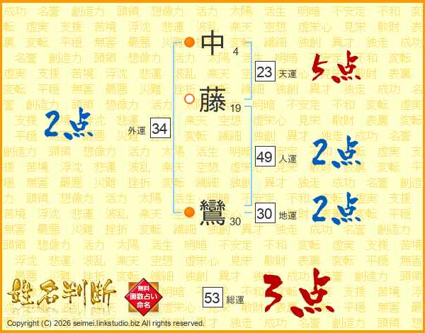 家系が持つ宿命的な運勢を表します。祖先から受け継いだ苗字ですので自分の力が及びません。家柄を象徴します。苗字の合計画数。