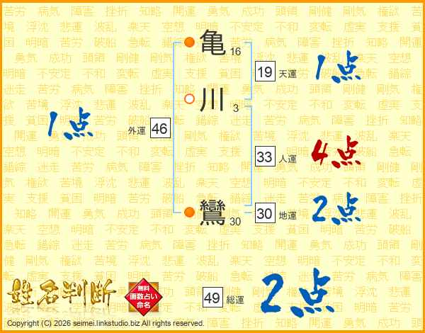 画数の奇数(○陽)と偶数(●陰)の配列で吉凶を占います。どちらかにかたよる名前は大凶名で避ける必要があります。画数の奇数偶数。