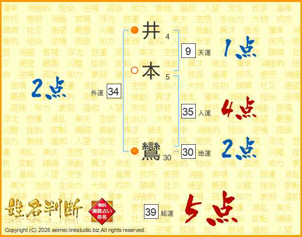 あなたの人生を表す1番重要な運勢です。生涯を通じて影響する総合運となり、主に50歳以降の晩年期に影響を及ぼします。苗字と名前の合計画数。