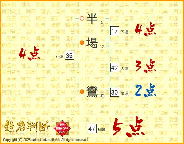 生活面を象徴する運勢です。外部から受ける影響力を表し、結婚運、家庭運や職場、環境への順応性を表します。総運から人運を引いた画数。姓や名が1文字の場合を除く。