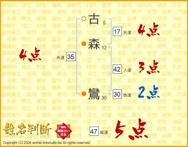画数の奇数(○陽)と偶数(●陰)の配列で吉凶を占います。どちらかにかたよる名前は大凶名で避ける必要があります。画数の奇数偶数。