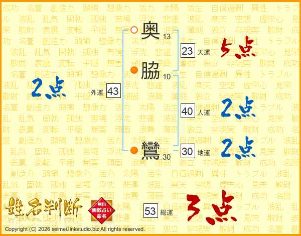奥(13画)脇(10画) 鸞(30画)