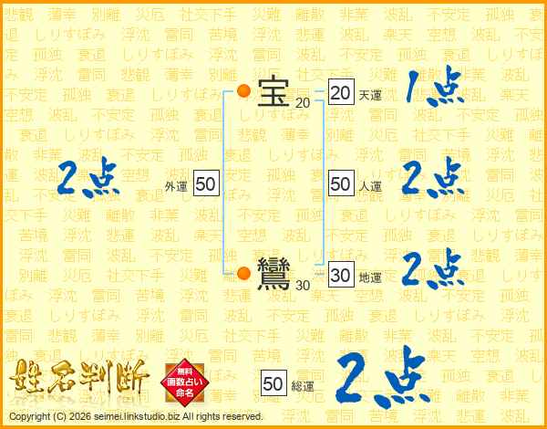 生活面を象徴する運勢です。外部から受ける影響力を表し、結婚運、家庭運や職場、環境への順応性を表します。総運から人運を引いた画数。姓や名が1文字の場合を除く。