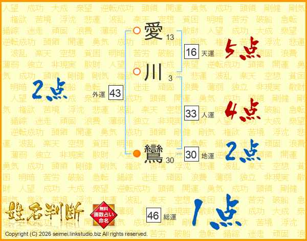 生活面を象徴する運勢です。外部から受ける影響力を表し、結婚運、家庭運や職場、環境への順応性を表します。総運から人運を引いた画数。姓や名が1文字の場合を除く。