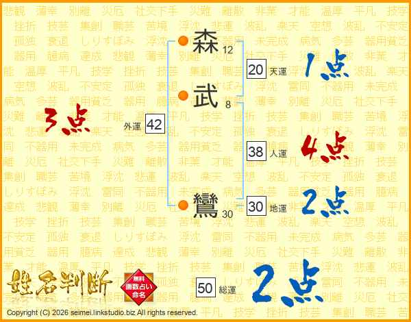 生活面を象徴する運勢です。外部から受ける影響力を表し、結婚運、家庭運や職場、環境への順応性を表します。総運から人運を引いた画数。姓や名が1文字の場合を除く。