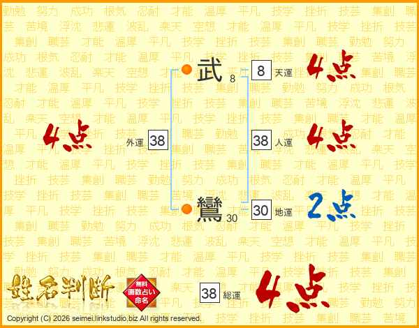 生活面を象徴する運勢です。外部から受ける影響力を表し、結婚運、家庭運や職場、環境への順応性を表します。総運から人運を引いた画数。姓や名が1文字の場合を除く。