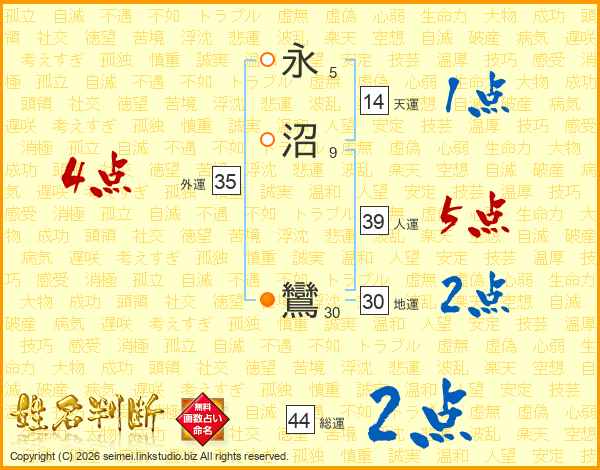 永沼鸞さんの総運は44画の2点