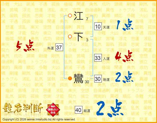 画数の奇数(○陽)と偶数(●陰)の配列で吉凶を占います。どちらかにかたよる名前は大凶名で避ける必要があります。画数の奇数偶数。