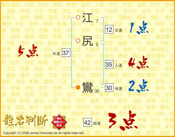画数の奇数(○陽)と偶数(●陰)の配列で吉凶を占います。どちらかにかたよる名前は大凶名で避ける必要があります。画数の奇数偶数。