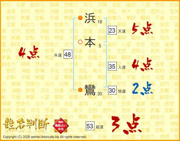 浜本鸞さんの総運は53画の3点!