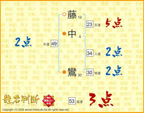 あなたの人生を表す1番重要な運勢です。生涯を通じて影響する総合運となり、主に50歳以降の晩年期に影響を及ぼします。苗字と名前の合計画数。