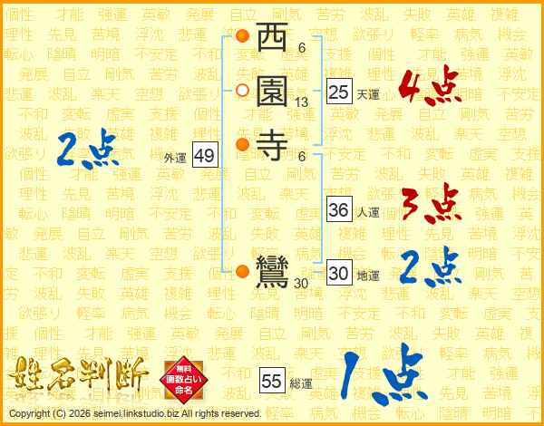 西(6画)園(13画)寺(6画) 鸞(30画)