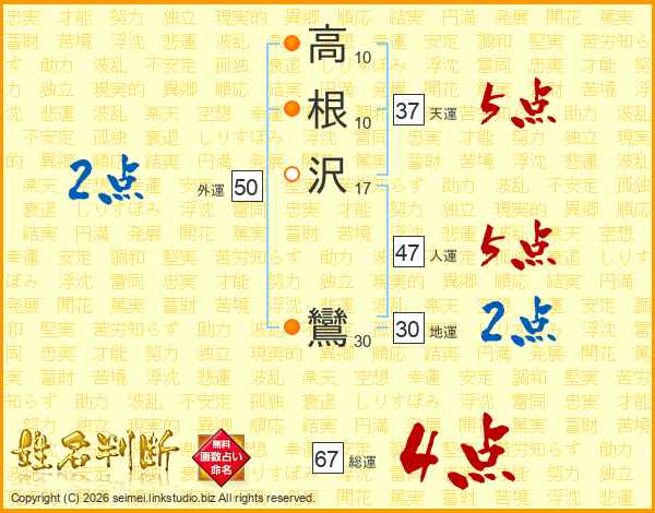 高(10画)根(10画)沢(17画) 鸞(30画)