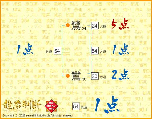 画数の奇数(○陽)と偶数(●陰)の配列で吉凶を占います。どちらかにかたよる名前は大凶名で避ける必要があります。画数の奇数偶数。