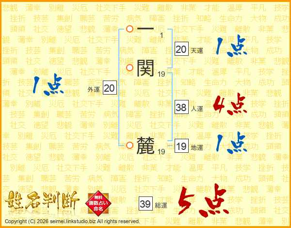生活面を象徴する運勢です。外部から受ける影響力を表し、結婚運、家庭運や職場、環境への順応性を表します。総運から人運を引いた画数。姓や名が1文字の場合を除く。