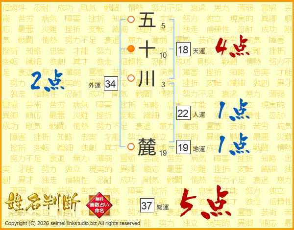 生活面を象徴する運勢です。外部から受ける影響力を表し、結婚運、家庭運や職場、環境への順応性を表します。総運から人運を引いた画数。姓や名が1文字の場合を除く。