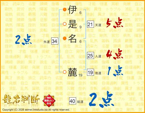 家系が持つ宿命的な運勢を表します。祖先から受け継いだ苗字ですので自分の力が及びません。家柄を象徴します。苗字の合計画数。