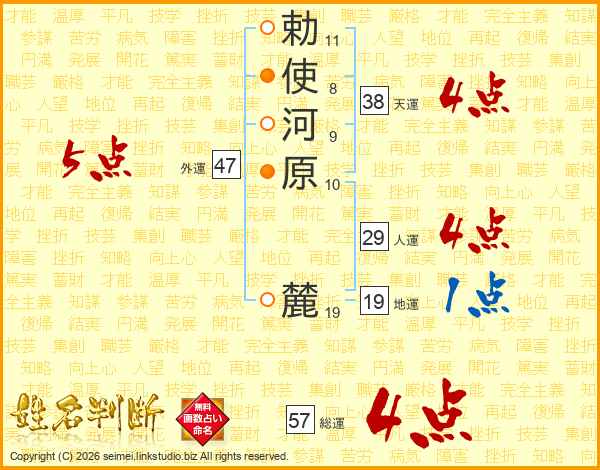 勅(11画)使(8画)河(9画)原(10画) 麓(19画)