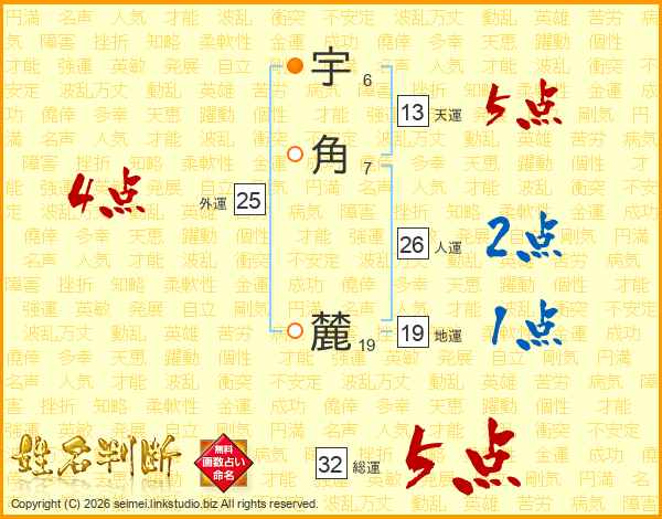生活面を象徴する運勢です。外部から受ける影響力を表し、結婚運、家庭運や職場、環境への順応性を表します。総運から人運を引いた画数。姓や名が1文字の場合を除く。