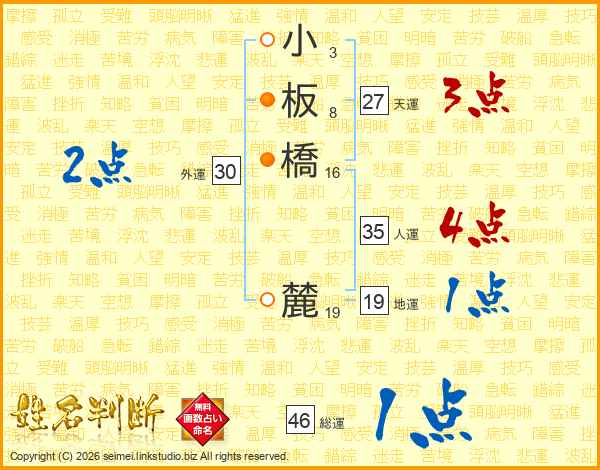 生活面を象徴する運勢です。外部から受ける影響力を表し、結婚運、家庭運や職場、環境への順応性を表します。総運から人運を引いた画数。姓や名が1文字の場合を除く。