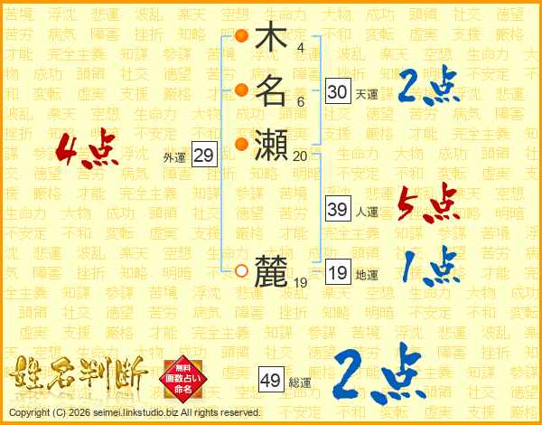 木(4画)名(6画)瀬(20画) 麓(19画)