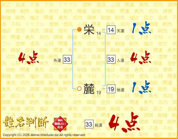 生活面を象徴する運勢です。外部から受ける影響力を表し、結婚運、家庭運や職場、環境への順応性を表します。総運から人運を引いた画数。姓や名が1文字の場合を除く。