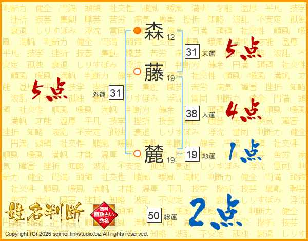 あなたの人生を表す1番重要な運勢です。生涯を通じて影響する総合運となり、主に50歳以降の晩年期に影響を及ぼします。苗字と名前の合計画数。