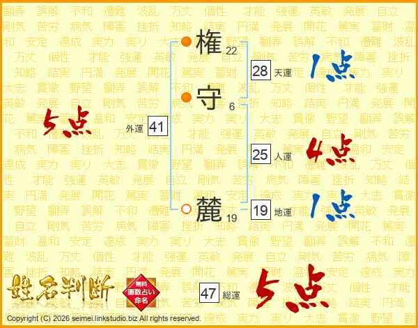 生活面を象徴する運勢です。外部から受ける影響力を表し、結婚運、家庭運や職場、環境への順応性を表します。総運から人運を引いた画数。姓や名が1文字の場合を除く。