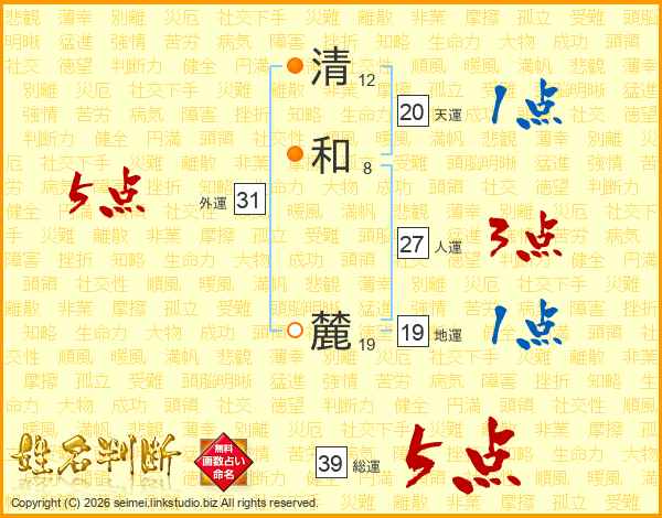 生活面を象徴する運勢です。外部から受ける影響力を表し、結婚運、家庭運や職場、環境への順応性を表します。総運から人運を引いた画数。姓や名が1文字の場合を除く。