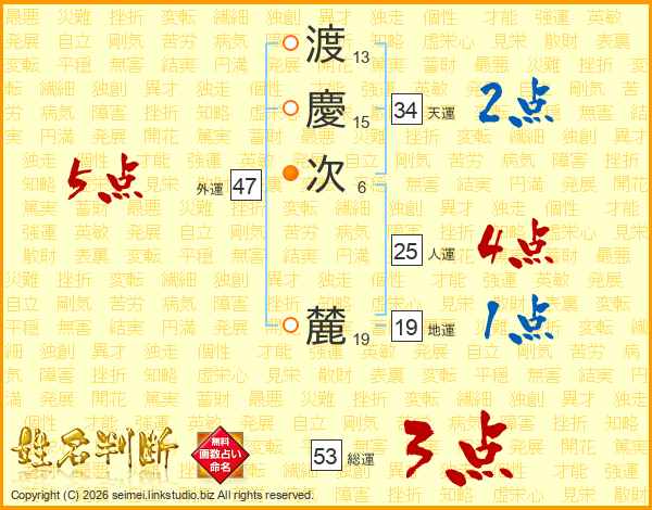 渡(13画)慶(15画)次(6画) 麓(19画)