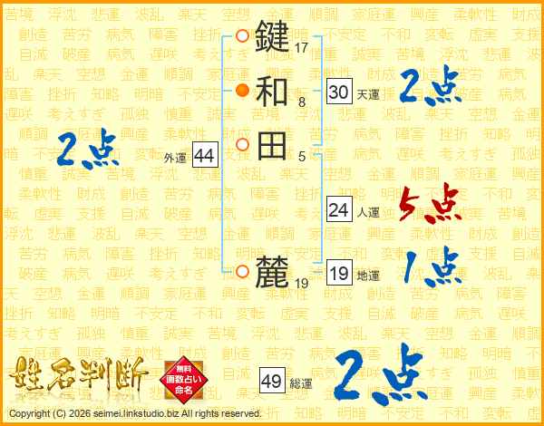 鍵(17画)和(8画)田(5画) 麓(19画)