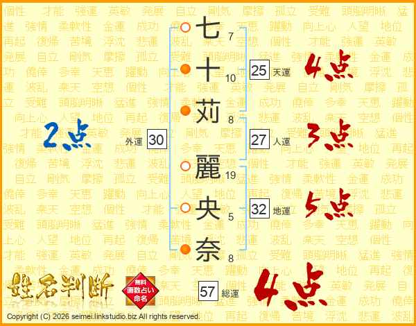七(7画)十(10画)苅(8画) 麗(19画)央(5画)奈(8画)