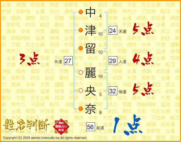 中(4画)津(10画)留(10画) 麗(19画)央(5画)奈(8画)