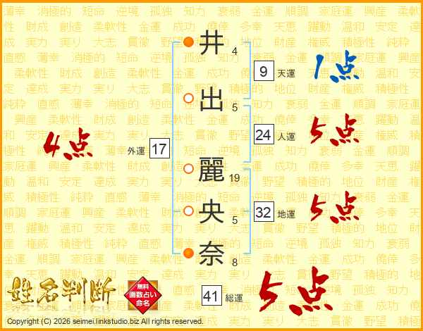 井(4画)出(5画) 麗(19画)央(5画)奈(8画)