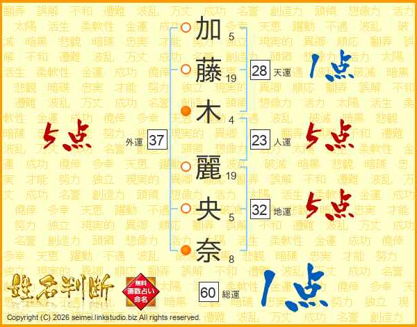 加(5画)藤(19画)木(4画) 麗(19画)央(5画)奈(8画)
