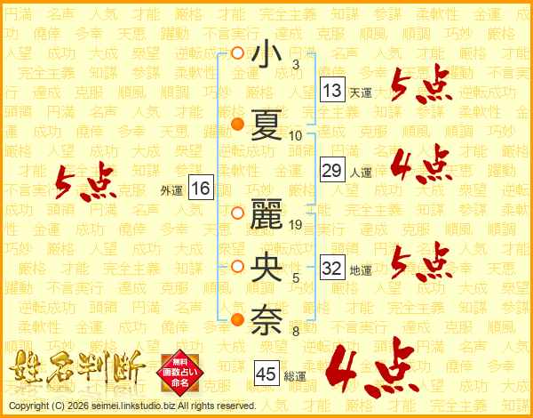 小夏麗央奈さんの総運は45画の4点!