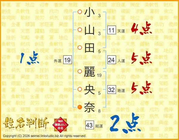 小(3画)山(3画)田(5画) 麗(19画)央(5画)奈(8画)