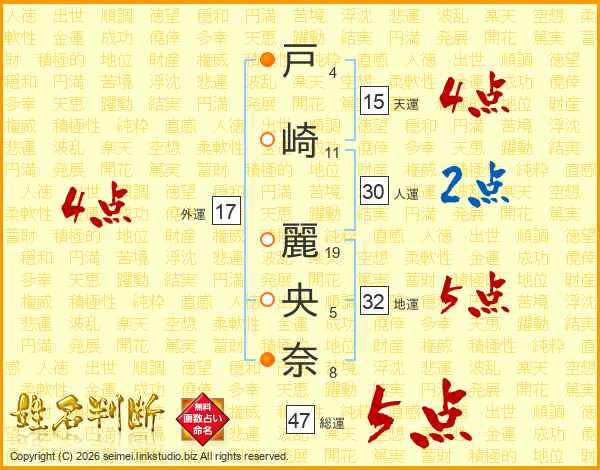 戸(4画)崎(11画) 麗(19画)央(5画)奈(8画)
