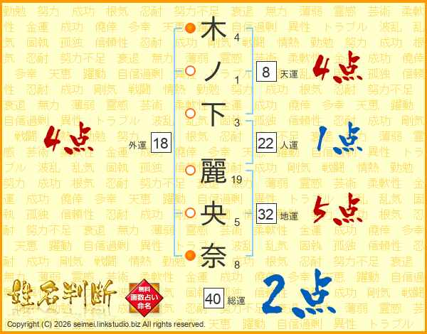 木(4画)ノ(1画)下(3画) 麗(19画)央(5画)奈(8画)