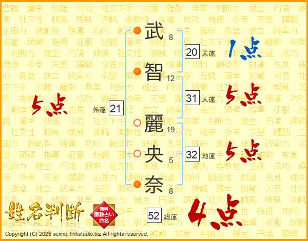 武(8画)智(12画) 麗(19画)央(5画)奈(8画)