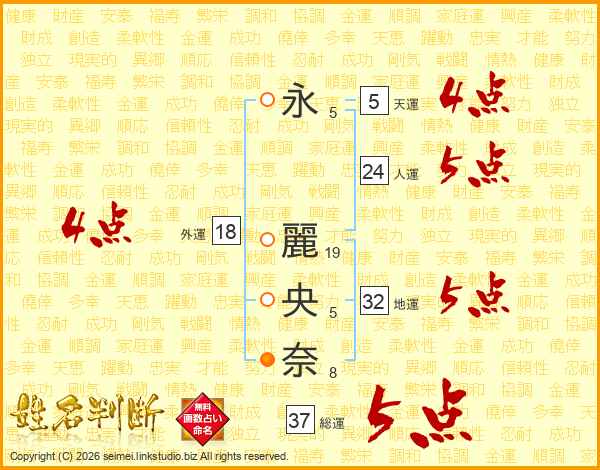 永(5画) 麗(19画)央(5画)奈(8画)