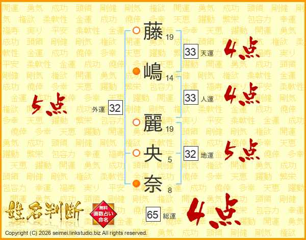藤嶋麗央奈さんの総運は65画の4点!